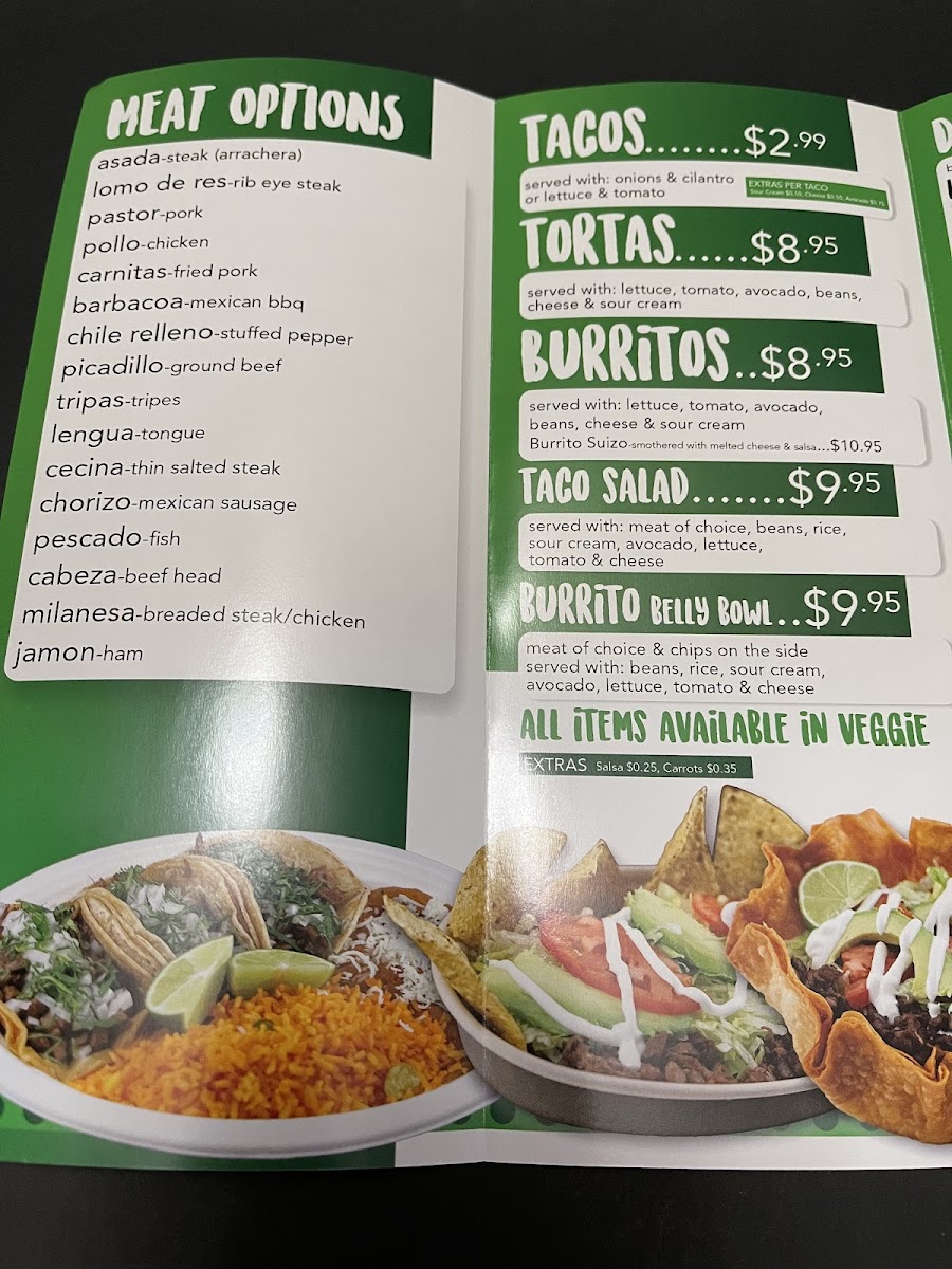 Torta meat of choice served with beans, lettuce, tomato, sour cream, cheese, avocado. Rice and beans on the side.