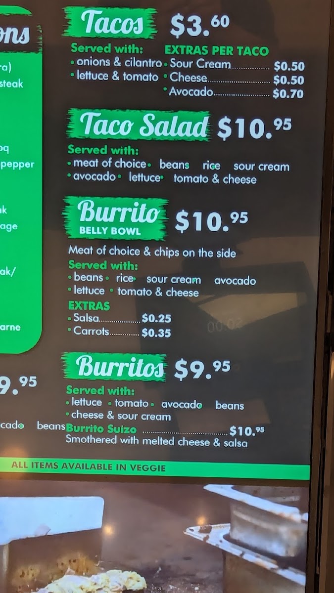 Served with meat choice, beans, rice, sour cream, cheese, avocado, tomato and lettuce.